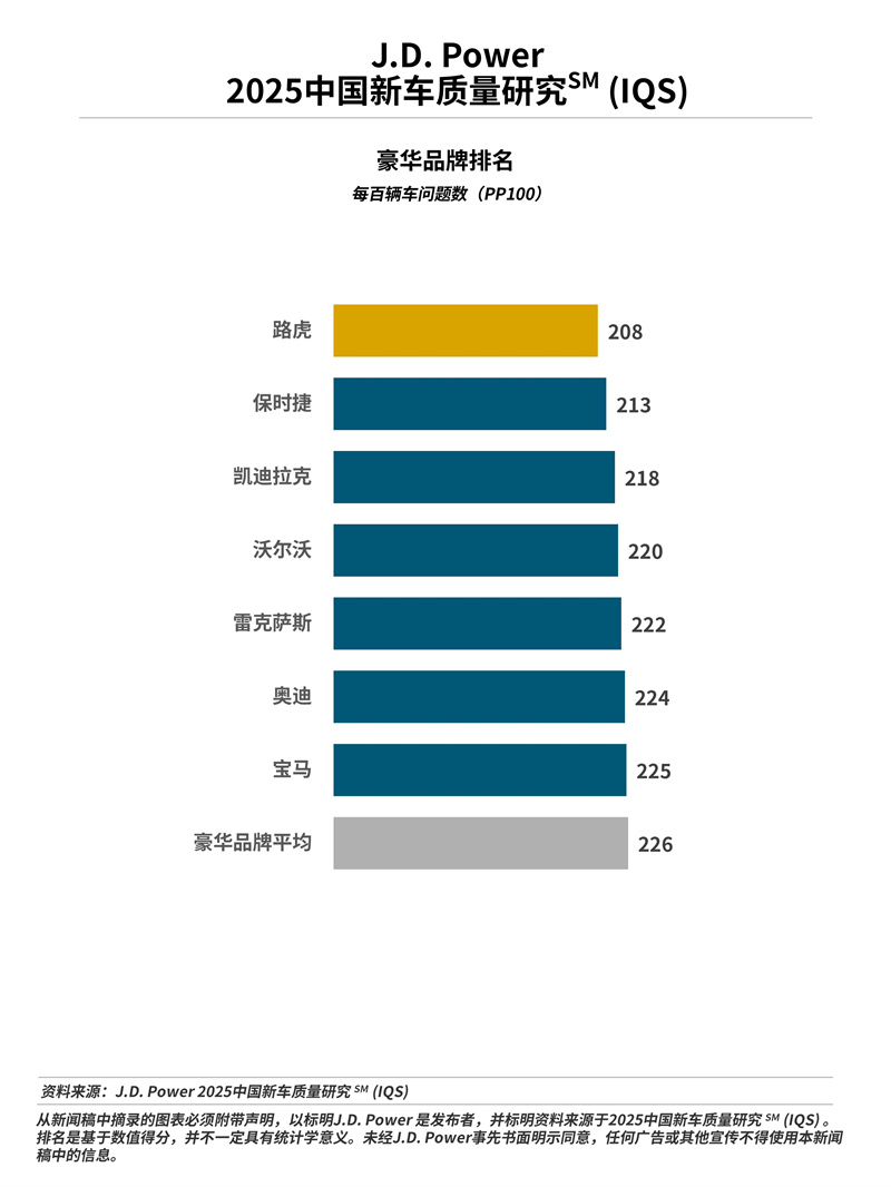 路虎(208個PP100)排名豪華品牌新車質(zhì)量第一。保時捷(213個P100)和凱迪拉克(218個PP100)分別排名豪華品牌第二和第三。