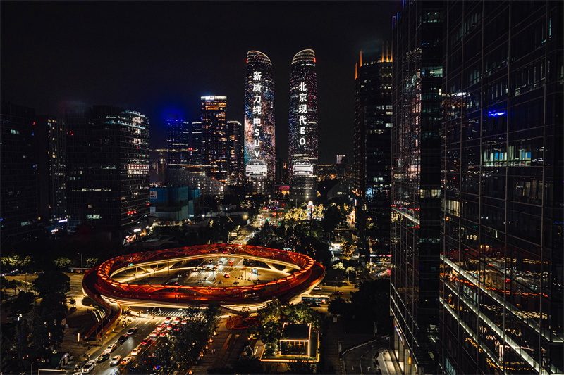 雙子塔高220米,以“冰花造型”外立面、全LOW-E中空玻璃幕墻著稱,成為成都科技與時尚融合的象征,被稱為“成都最美天際線”。北京現代EO(ELEXIO)在此亮相,雙子塔的燈光秀與車型科技感、現代美學高度契合,兩者相得益彰。