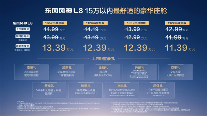 8月29日,成都國際車展,東風風神全新旗艦SUV——東風風神L8正式上市,以11.39萬元起的限時置換價(可疊加享受國/地補)強勢切入家用SUV市場,徹底打破了“高端舒享配置必屬高價”的固有認知,樹立了15萬級SUV的“舒享座艙”新標桿。
