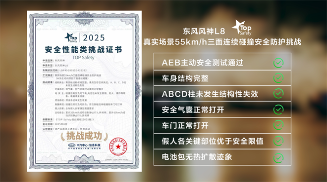 東風風神L7傳承品牌安全基因,此前公開的三面高速連續(xù)碰撞測試證明其在極端狀況下仍能保持車身結(jié)構(gòu)完整,電池安全無憂,為全家提供可靠防護。