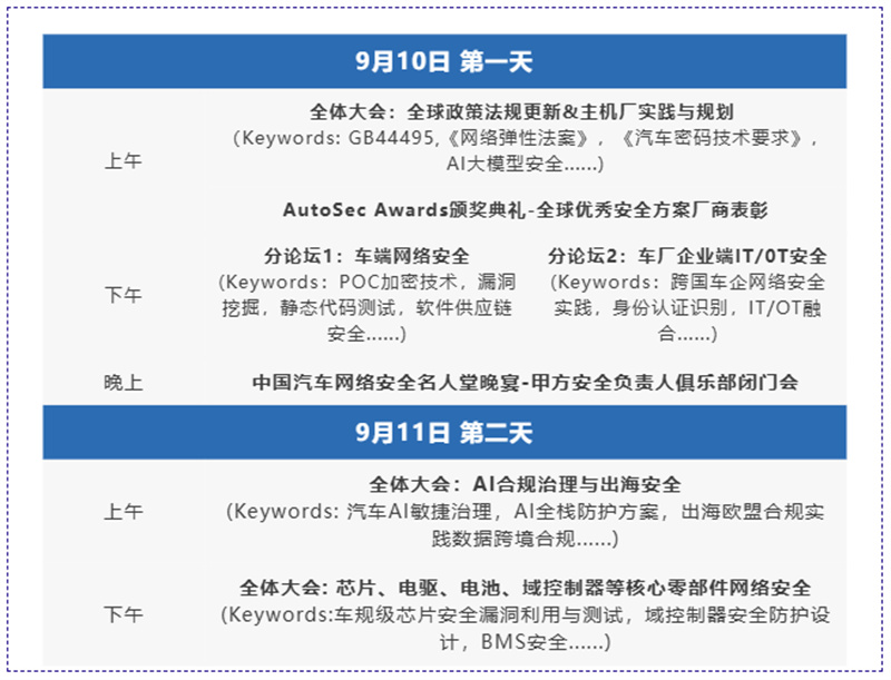 本屆大會以“多場景全鏈路”汽車安全防護為核心脈絡(luò),不僅涵蓋2場主題峰會與多場專題分論壇,更通過AutoSec 安全之星頒獎典禮、名人堂晚宴、全景圖、攻防演練、展商產(chǎn)品展示等特色活動,串聯(lián)起從技術(shù)研討到產(chǎn)業(yè)落地的完整閉環(huán)。