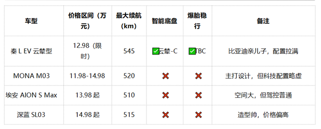 秦L EV云輦型限時12.98萬,而全系起步價直接殺到10.98萬。我們來拉個表對比一下同級熱門選手: