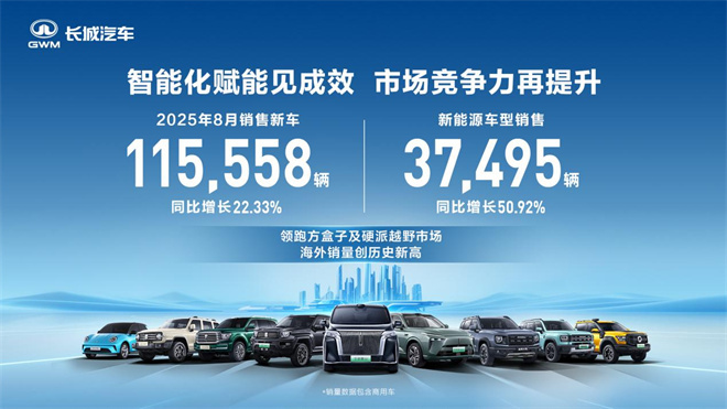 長城汽車8月銷售新車115,558輛,同比增長22.33%;