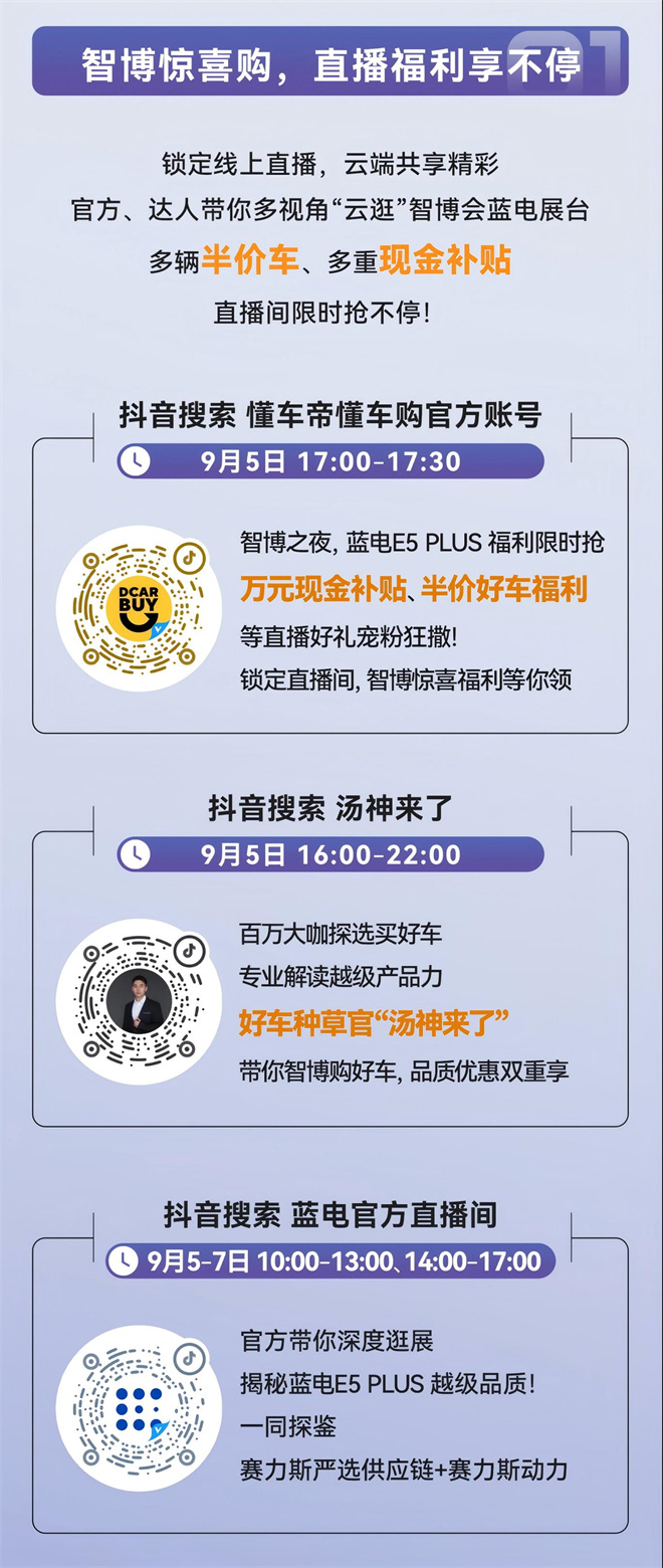 9月5日,藍電汽車聯(lián)動頭部媒體開展“智博驚喜購”直播活動,帶來半價車、萬元現(xiàn)金補貼等眾多驚喜直播好禮,疊加直播間多重補貼后,藍電 E5 PLUS 先享版價格僅7.68萬起;并且還聯(lián)合頭部達人“@湯神來了”進行6小時專場直播,達人將以專業(yè)視角為用戶提供選買指導,直播期間更有多重好禮放送。