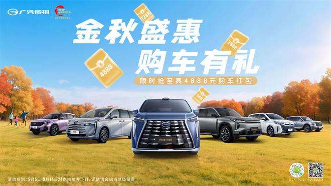 金秋盛惠,購車有禮!9月5日至9月14日,參與傳祺GS4 MAX限時搖紅包活動,下訂即有機會抽取至高4888元購車紅包。
