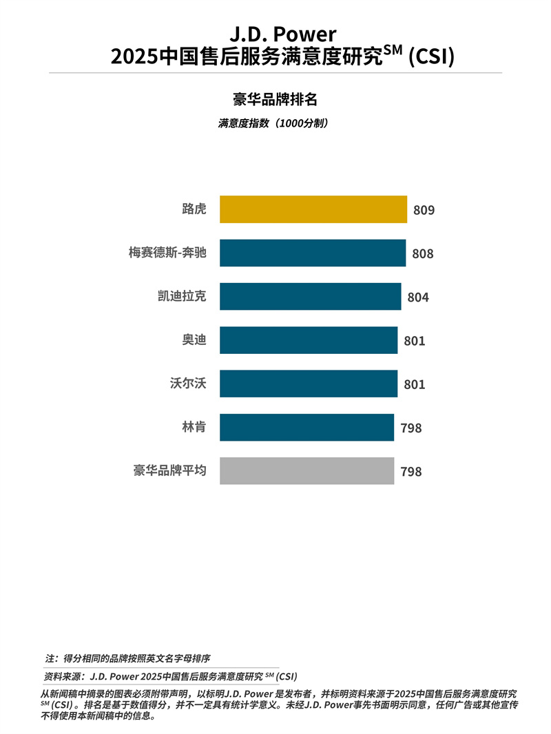 路虎以809分排名豪華品牌售后服務(wù)滿意度第一,梅賽德斯-奔馳以808分排名豪華品牌第二,凱迪拉克以804分排名豪華品牌第三。