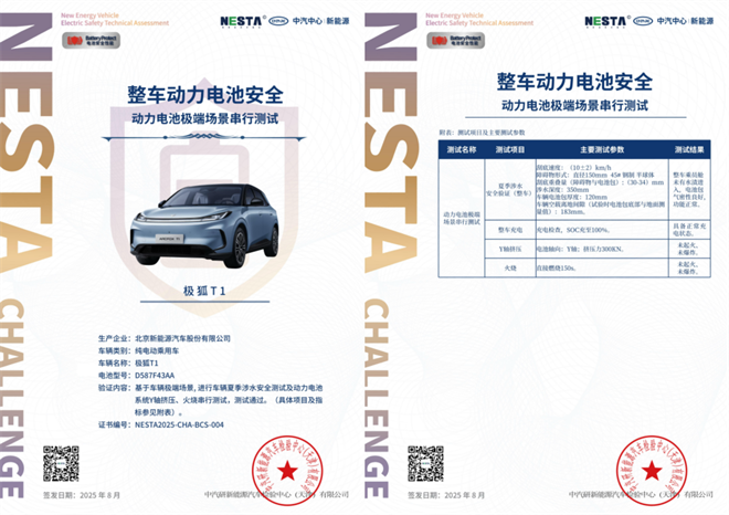 T1的極光電池安全同樣“卷到極致”,延續極狐一貫的電池安全高標準,T1所采用的極光電池全面通過了新國標17項系統測試和6項關鍵測試,在“不起火、不爆炸”的基礎上,“超綱”實現“無熱擴散”,并且提前了一年。在中汽研主導的動力電池極端場景串行測試中,極狐T1成功完成350mm水下刮底、500m顛簸,300kN極限擠壓,150s極限火燒三大挑戰,成為首批獲得動力電池新國標認證的汽車。
