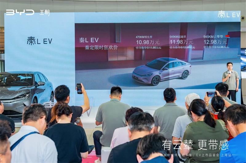 最令人驚喜的是,比亞迪王朝網(wǎng)銷售事業(yè)部運營經(jīng)理師盼帥現(xiàn)場公布了新車價格——秦L EV全系限時狂歡價10.98萬元起,云輦型起售價12.98萬元。價格公布瞬間,現(xiàn)場掌聲雷動,嘉賓們的期待與熱情被瞬間點燃。