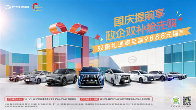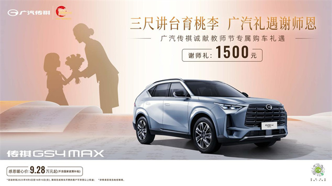 9月15號至9月30號還有國慶提前享活動,發票金額在10萬-20萬元,可領廣州政府4000元補貼,還可參與廣汽傳祺下訂抽獎,至高贏4888元紅包。10月15號之前教職工也有專屬福利,本人及直系親屬購車優惠1500元!