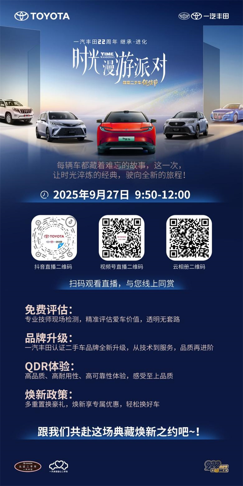 正是這份對自身價值的充分信心,為用心回應千萬車主的深厚信賴,一汽豐田從2021年起打造專屬二手車品牌IP——“922保值節”。這一節日是一汽豐田對全周期用車體驗、卓越產品品質與安心出行保障的集中踐行與鄭重承諾。保值節已成為廣大車主信賴與期待的年度盛會。