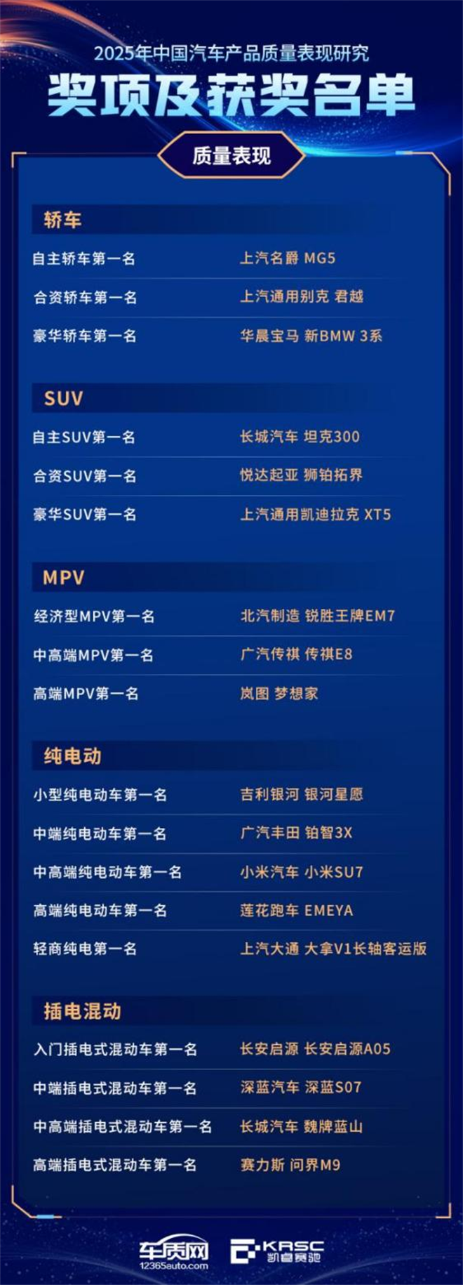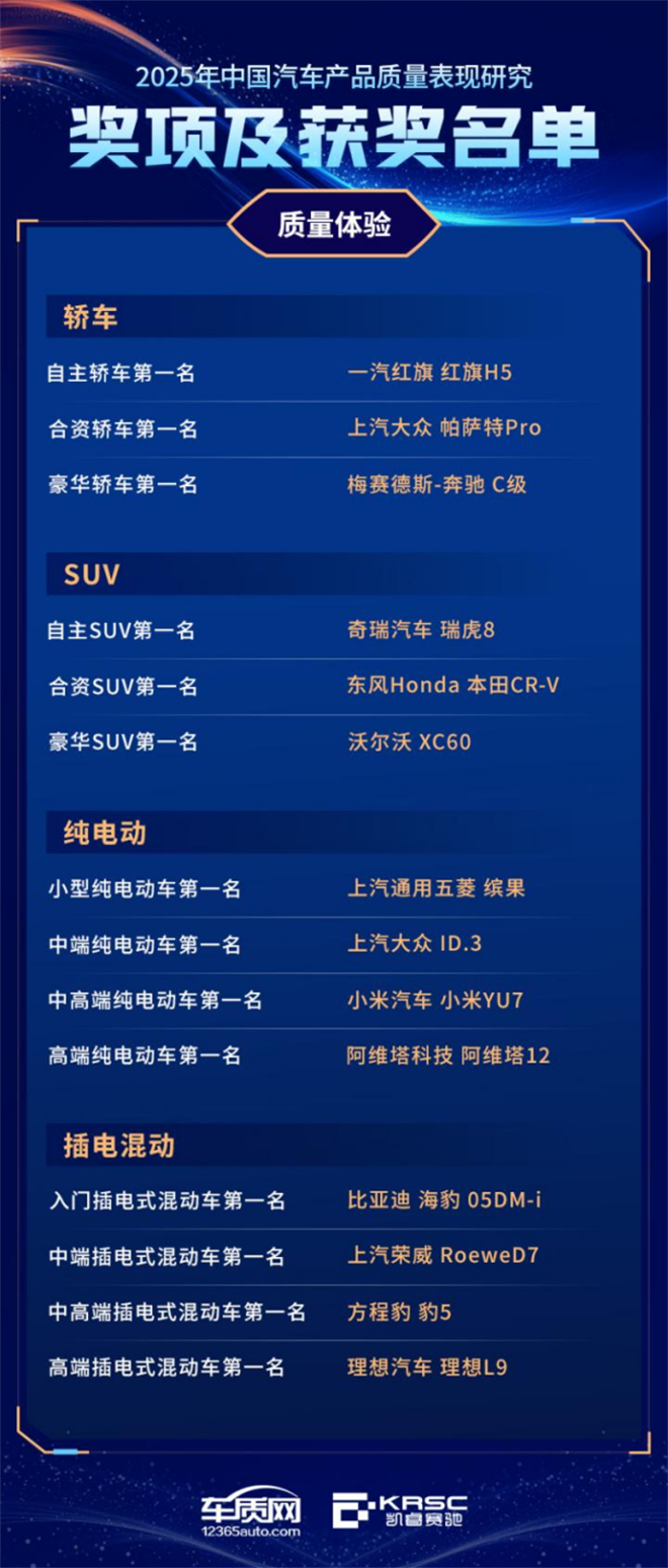 依據《2025年中國汽車產品質量表現研究(AQR)》結果,主辦方還公布了整車各細分市場質量表現及質量體驗最佳車型,以及純電動汽車續航滿意度最佳表現產品。中國汽車產品質量表現獎獲獎車型,在產品可靠性與穩定性方面領先于細分市場,是對整車在質量控制與耐久性方面表現的有力印證。中國汽車產品質量體驗獎獲獎車型,在舒適性、便利性、駕乘感受等方面表現卓越,能夠更好滿足消費者核心用車需求。純電動汽車續航滿意度最佳表現獎獲獎車型,在新能源出行體驗中實現“數據表現”與“用戶預期”的高度匹配,是純電動車續航信心與用戶信賴的雙重背書。