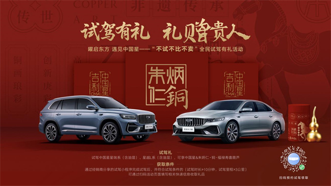 即日起至12月31日,針對購買中國星星瑞全系、星越L全系用戶,每月將在第三方檢測機構的監督與公證下,抽取300名幸運用戶免費贈送中國星東方曜限量定制款MEIZU 22手機。此外,吉利中國星還攜手中國非遺銅雕文創品牌——朱炳仁·銅,發起“試駕有禮,禮贈貴人” 不試不比不賣全民試駕有禮活動,到店試駕中國星星瑞、星越L系列車型,即可獲贈由“朱炳仁·銅”匠心打造的【福祿壽喜葫蘆掛件】一份。