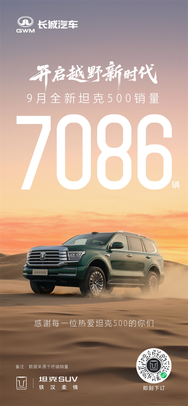 2025年9月,坦克品牌再度交出亮眼成績單:旗下重磅車型全新坦克500單月銷量達(dá)7086輛,成為30萬級以上新能源越野SUV市場中勢頭強(qiáng)勁的“銷量標(biāo)桿”。