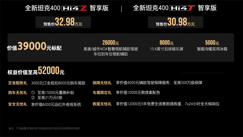 目前全新坦克400 Hi4-Z智享版、全新坦克400 Hi4-T智享版已同步開啟預售,預售期間預訂可享6重尊崇權益,全新坦克400以滿滿誠意為年輕用戶體驗潮酷越野帶來驚喜購車優惠。