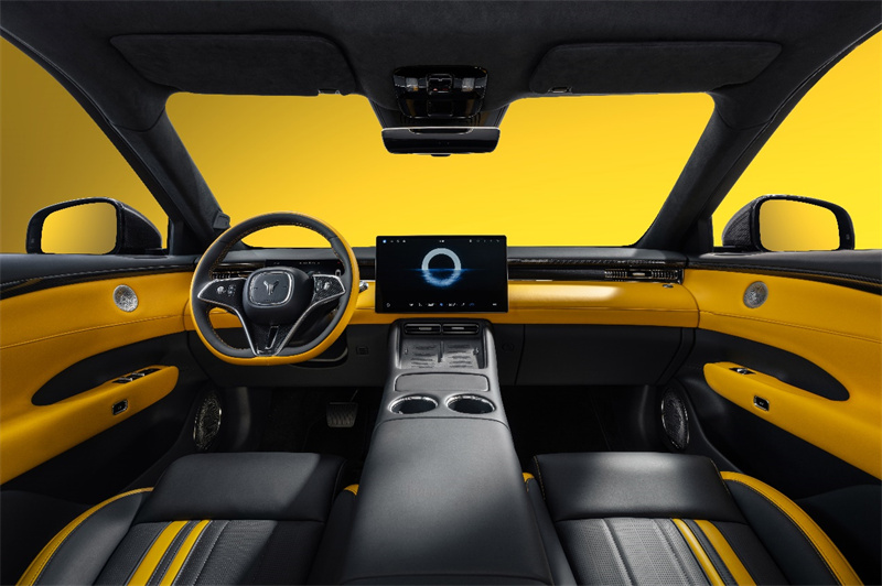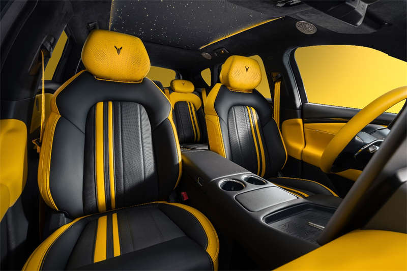 新車內(nèi)飾延續(xù)外觀撞色設(shè)計,采用玄金雙拼撞色內(nèi)飾,跳脫的對比色瞬間點燃座艙氣氛,激發(fā)駕駛欲望。儀表臺、門護板、方向盤、座椅等關(guān)鍵區(qū)域均有黃色超纖包覆,與A/B/C柱及頂棚的仿麂皮材質(zhì),共同營造出激情、豪華的內(nèi)飾氛圍。升級定制的NAPPA環(huán)抱式運動座椅,精選頭層牛皮帶來溫潤細膩的觸感,嚴密的人體工學(xué)設(shè)計確保在激烈駕駛時提供全方位的支撐與包裹;暗影啞光碳纖維組件覆蓋外后視鏡、駕駛艙前內(nèi)飾面板、方向盤等部分,100%真碳纖維絲帶來的獨特紋理與質(zhì)感,點亮了座艙的運動豪華氣息。