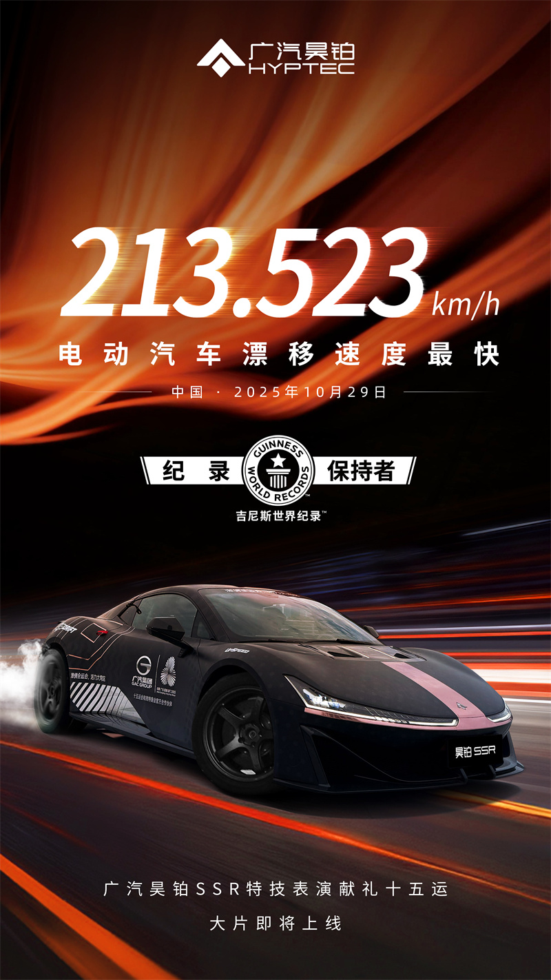 2025年10月29日,廣汽昊鉑旗下純電超跑昊鉑SSR刷新了純電車漂移最高時速吉尼斯世界紀錄。中國漂移車手葉志成駕駛昊鉑SSR完成極限漂移挑戰,在30度漂移角度維持超50米的高難度條件下,以213.523km/h的漂移速度刷新了純電車漂移最高時速世界紀錄。