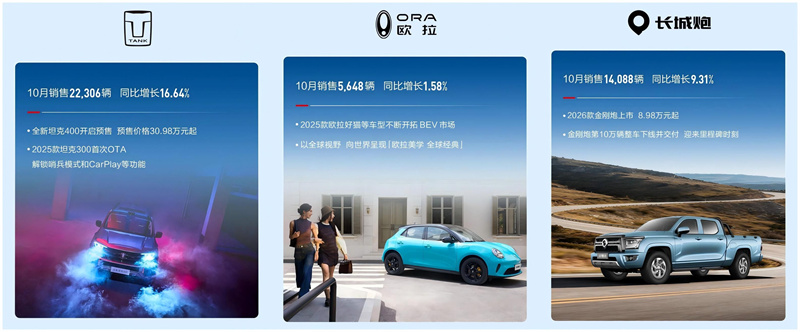 坦克品牌10月銷售22,306輛,同比增長(zhǎng)16.64%,全新坦克400于10月開(kāi)啟預(yù)售,搭載Coffee OS3智能系統(tǒng)與高通驍龍8295芯片,配備全場(chǎng)景NOA智駕功能,為后續(xù)增長(zhǎng)注入強(qiáng)勁動(dòng)力。長(zhǎng)城皮卡10月銷售14,088輛,同比增長(zhǎng)9.31%,2026款金剛炮上市當(dāng)月便迎來(lái)第10萬(wàn)輛下線的里程碑,性價(jià)比優(yōu)勢(shì)凸顯。