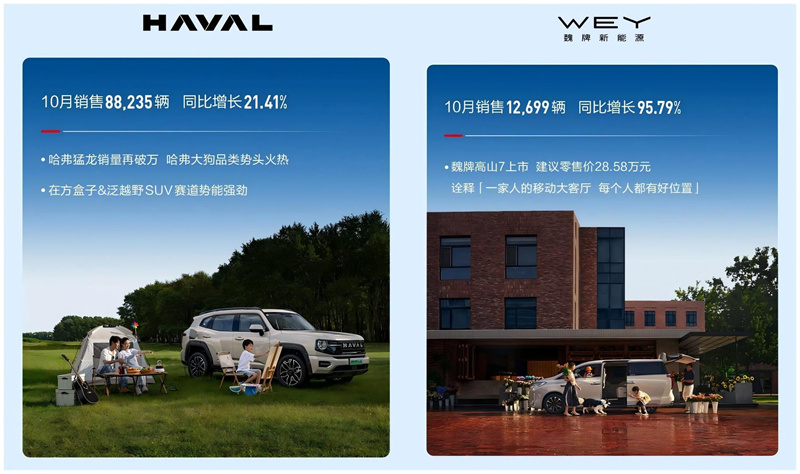 各品牌的均衡發(fā)力為整體銷量提供了堅(jiān)實(shí)支撐。哈弗品牌作為銷量擔(dān)當(dāng),10月銷售88,235輛,同比增長(zhǎng)21.41%,2026款大狗憑借高性價(jià)比配置持續(xù)熱銷,猛龍則以燃油與插混雙版本布局泛越野市場(chǎng),雙線激活銷量。魏牌新能源表現(xiàn)最為迅猛,10月銷量12,699輛,同比暴漲95.79%,剛上市的魏牌高山7以“移動(dòng)大客廳”定位切入家庭市場(chǎng),收獲市場(chǎng)認(rèn)可。