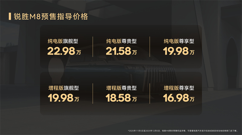 目前,銳勝M8增程版169800元起、EV版199800元起的預售價格已正式公布,這款聚焦全場景需求的大型MPV,能否贏得市場青睞,成為MPV領域的“品質標桿”,值得期待。