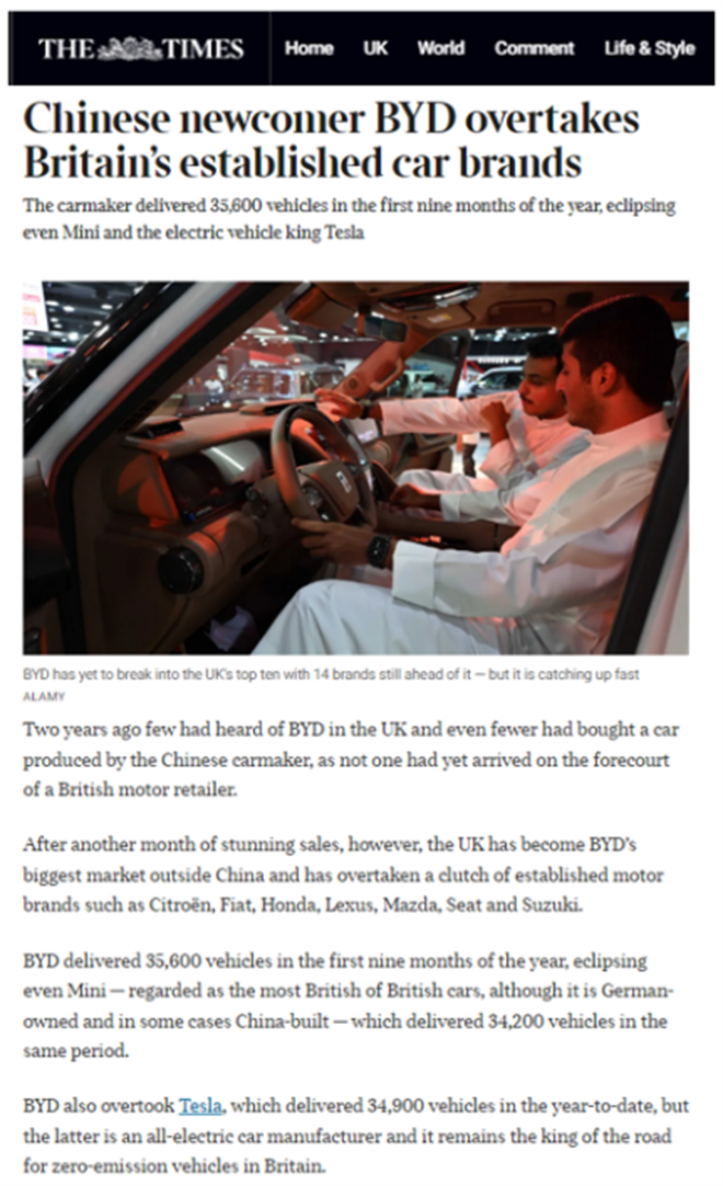 圖3:《泰晤士報》:中國新晉品牌比亞迪超越英國老牌汽車品牌