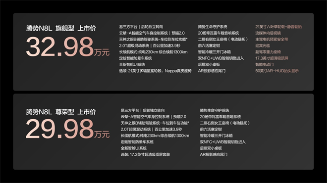 騰勢N8L售價為29.98萬元-32.98萬元,上市以來持續熱銷,為回饋用戶厚愛,推出限時購車權益,價值至高達10.67萬元!包括價值1.7萬元的三年免息,最高1萬元的置換補貼。此外,在2025年11月30日24點前完成合同簽署的用戶,如果因非用戶原因車輛未及時交付,導致開票實際發生在2026年,可享受購置稅差額補貼,最高1.5萬元!用戶不必擔心因為交車晚,而享受不到購置稅補貼。