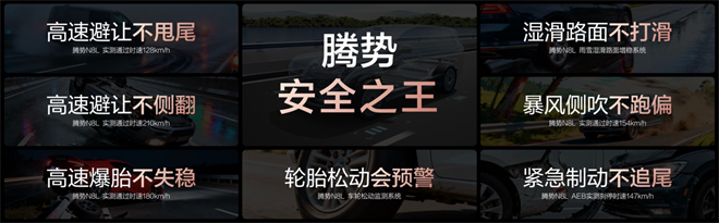 主動安全方面,得益于易三方,騰勢N8L能夠以128km/h高速避讓不甩尾、210km/h高速避讓(魚鉤測試)不側翻、180km/h高速爆胎不失穩、154km/h暴風側吹不跑偏、147km/h AEB自動緊急制動、不怕雨雪路面打滑、車輪松動監測系統,以科技安全守護家人出行安心。騰勢汽車不愧被稱為新能源汽車的“安全之王”。