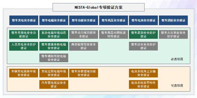 2025年,“技術驅動”與“全球化”成為中國新能源汽車行業的關鍵詞,考慮到消費者在實際用車過程中的復雜工況,NESTA 2026版引入多工況串行測試方案,從而更好地支持企業優化開發節奏、提升電安全品質。在2025版基礎上,NESTA 2026版優化、合并5個驗證項目,并基于行業發展需求新增多個測試內容,形成11個必選項,27個可選項的體系框架,以滿足企業多樣化、場景化的技術驗證需求。