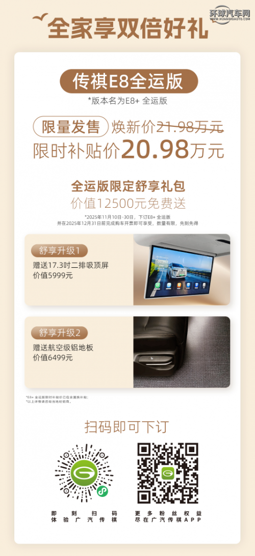 當全運會催生家庭場景新需求,廣汽集團既以實際行動為賽事護航,更立足對家庭出行需求的深刻洞察,量身打造專屬升級車型——傳祺E8全運版,并于11月10日滿愛登場。這款升級車型煥新價21.98萬元,限時補貼價僅 20.98 萬元,既是傳祺對“大廠時代用戶定義權”的實踐,更是為家庭觀賽出行量身定制的最優解。