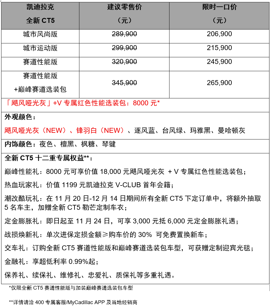 (11月21日)2025廣州車展凱迪拉克展臺化身熱血賽道派對,明星車型全新CT5以滿改姿態熱血登場。此次,全新CT5發布了V專屬性能車色「颶風啞光灰」及V專屬紅色性能選裝包:包括專屬Brembo V標涂裝紅色高性能卡鉗、賽道專屬紅色鑰匙等性能裝備。同時,用戶還可享受12重豐富豪禮,包括以8000元解鎖價值18000元熱血裝備的巔峰性能禮、限時3000元抵6000元的定金膨脹禮、限時贈送價值1199元V-CLUB會籍的熱血玩家禮等。值得一提的是,全新CT5還推出了王炸級“戰損煥新禮”,車輛單次定損超三成即可免費置換等價新車,為年輕人的第一臺后驅車霸氣兜底。源于純粹的賽道熱愛,凱迪拉克全新CT5出廠即滿改,本色出街熱血上場。