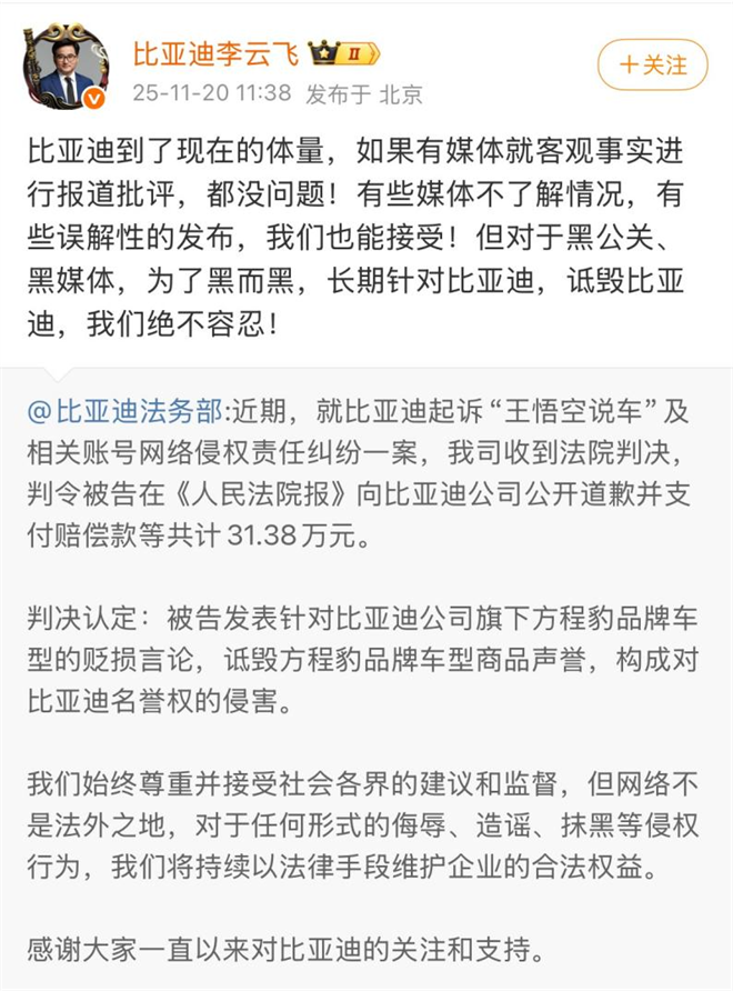近日,比亞迪起訴自媒體賬號 “王悟空說車” 及相關主體的網絡侵權責任糾紛一案塵埃落定。11 月 20 日,比亞迪法務部發布公告披露,法院經審理認定,被告發表針對比亞迪旗下方程豹品牌車型的貶損言論,已構成對企業名譽權的侵害,最終判決被告需向比亞迪公開賠禮道歉,并支付共計 31.38 萬元賠償款。隨后,比亞迪集團品牌及公關處總經理李云飛轉發該公告并表示:“比亞迪到了現在的體量,部分媒體因不了解情況發布誤解性內容,我們能夠理解并接受,但對于黑公關、黑媒體,為了黑而黑,長期針對、詆毀比亞迪的行為,我們絕不容忍!”此前在公開活動中,李云飛也曾明確立場:“如果有些媒體或自媒體惡意的揣著明白裝糊涂,為了黑而黑,通過一些不實的和誤導性的報道和信息,長期針對比亞迪,詆毀比亞迪,比如說一個禮拜有七天,至少五個工作日都在黑比亞迪,這個是不能接受也不能容忍的。”