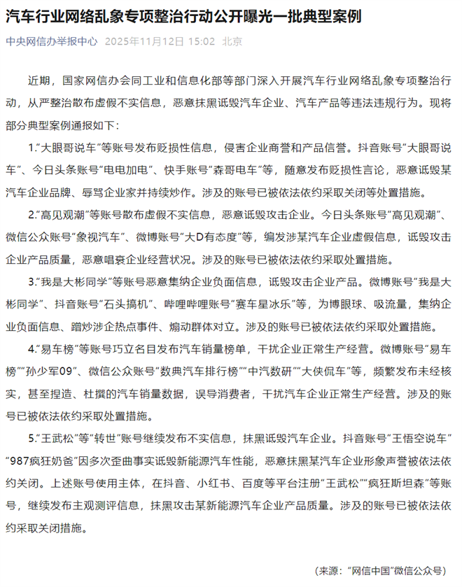 此前,中央網信辦在《汽車行業網絡亂象專項整治行動公開曝光一批典型案例》中就明確指出,抖音賬號“王悟空說車”“987瘋狂奶爸”因多次歪曲事實詆毀新能源汽車性能、惡意抹黑汽車企業形象聲譽,被依法依約關閉。