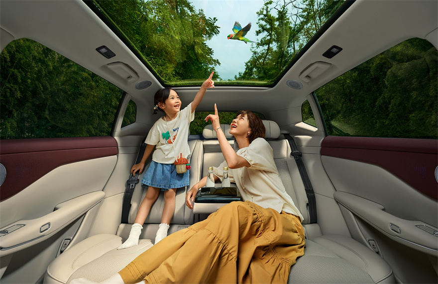 除了化身打工人“午休新據點”,全新嵐圖知音的百變空間還能滿足用戶多元化的生活需求。放倒前排座椅,座艙秒變“親子娛樂房”,成為寶媽帶娃逛街的臨時歇腳地,親子共賞電影、互動游戲的溫馨場景盡顯家庭溫度。二排放倒連接后備廂,搭配天幕與軟墊,又能化身“露營大床房”,讓城市家庭隨時解鎖“移動星空營地”的浪漫體驗。