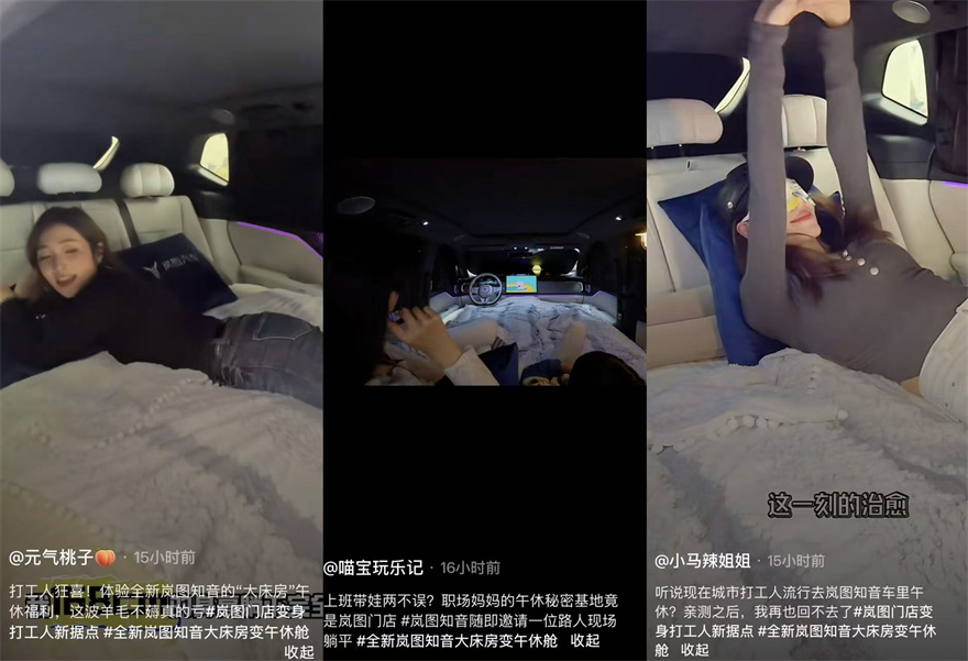 打工人午休終于告別趴桌“坐牢”時代!最近,一股“午休Gap”風悄悄席卷各大城市商圈,而嵐圖汽車多家門店直接把全新知音打造成“豪華大床房”,配備午休枕、遮光眼罩甚至香薰機,讓上班族在午間實現真正的“躺平自由”。這一操作意外擊中了打工人的痛點,讓門店悄然變成城市打工人的“午休新據點”。