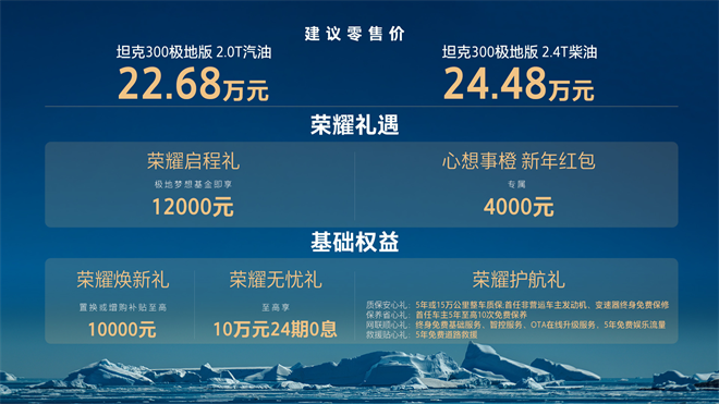 2025年12月11日,在坦克300全球用戶突破50萬的歷史性時(shí)刻,坦克300極地版正式上市。這款新車型提供2.0T汽油和2.4T柴油兩個(gè)版本,售價(jià)分別為22.68萬元和24.48萬元。