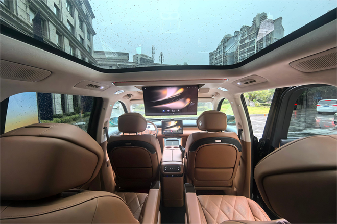 細節之處,皆是科技寫就的儀式感。靠近車輛,流光星辰門把手與動態迎賓光毯同步亮起,電動踏板悄然伸出。坐進“山海萬象”座艙,AI云舒座椅已通過66顆傳感器感知身形,自動調節至貼合狀態。32揚聲器的天籟之聲與多層靜謐玻璃,瞬間將外界紛擾隔離。