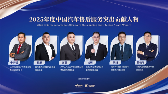獲得2025年度中國汽車售后服務突出貢獻人物獎的分別是:江蘇悅達起亞汽車有限公司售后服務部部長申宗明,蔚來服務運營區域管理部高級總監祁樂,沃爾沃汽車大中華區銷售公司售后服務質量總監蘇毅,領克汽車銷售有限公司服務體驗部總監杜萌,問界汽車銷售有限公司銷服體系副總經理耿新,以及長城汽車售后服務中臺副總經理郭艷增。