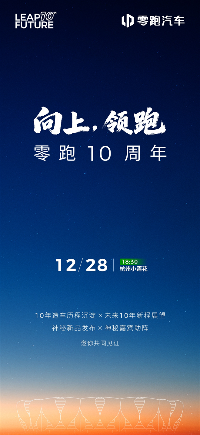 同時,零跑汽車宣布將于12月28日在杭州奧體中心體育館(小蓮花)舉辦以“向上,領跑”為主題的十周年發布會。在成立十周年這一重要節點,零跑汽車盛情邀請十年來砥礪同行的員工代表、用戶代表、伙伴代表、投資方代表等,共同見證這一凝聚過往、開啟未來的歷史性時刻。