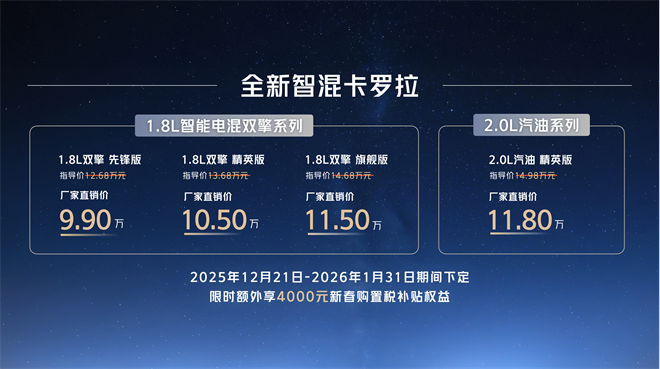 12月21日,“全球好品質 中國新家轎”全新智混卡羅拉煥新上市,共推出4個版本,廠商直銷價為:9.9萬元-11.8萬元。即日起至1月31日期間下定,限時額外享受4000元新春購置稅補貼權益。