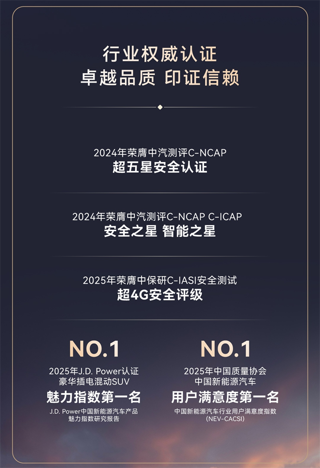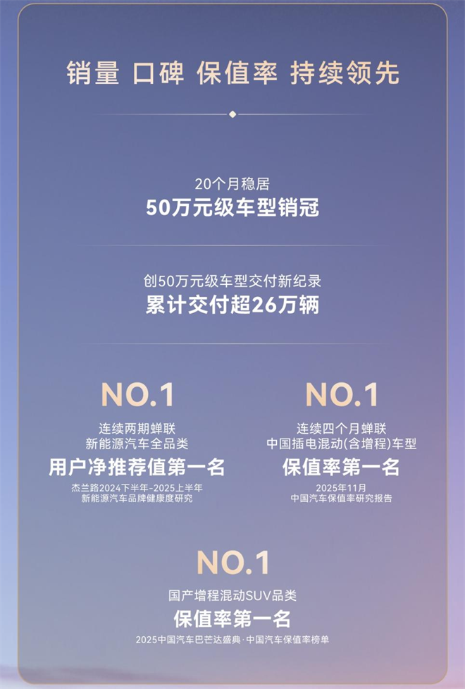兩年來,問界M9不僅贏得了市場,更獲得了用戶的高度認可。在杰蘭路2024下半年-2025上半年新能源汽車品牌健康度研究中,問界M9連續兩期獲得新能源全車型用戶凈推薦值第一。此外,在中國質量協會發布的2025年中國新能源汽車行業用戶滿意度指數評測結果中,問界M9榮獲第一名,在J.D. Power 魅力指數榜單中位列豪華插電混動SUV第一……這一系列殊榮,共同印證了這款現象級產品在新能源豪華車市場的領先實力,展現獨特的標桿魅力。