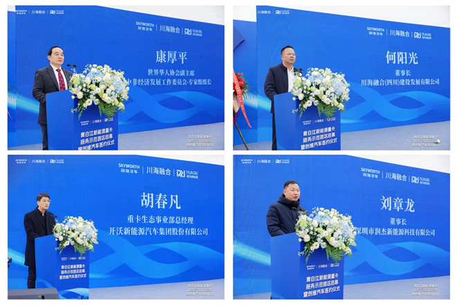 世界華人協會副主席、中非經濟合作發展委員會專家組組長康厚平先生為活動致開幕辭,從宏觀層面闡述了新能源物流發展的戰略意義與未來趨勢。接著川海融合(四川)建設發展有限公司董事長何陽光先生在發言中感謝創維汽車的攜手與信賴,也致敬一線員工的辛勤付出。隨后,開沃新能源汽車集團股份有限公司重卡生態事業部總經理胡春凡先生感謝各位伙伴的信任,讓創維汽車新能源重卡正式投入川渝藏綠色保供運輸場景。最后深圳市潤杰新能源科技有限公司董事長劉章龍先生感謝各方支持,回顧了項目從藍圖到落成的奮斗歷程。