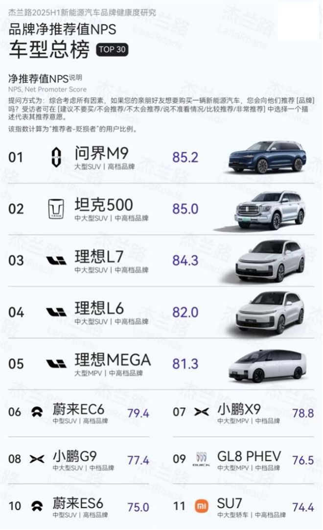 扎實的技術底氣最終要轉化為市場認可,而鴻蒙智行在這方面的表現同樣令人印象深刻。根據杰蘭路《2025年度上半年新能源汽車品牌健康度研究》,問界品牌位居品牌發展信心指數榜首,其旗艦車型問界M9更是以85.2分的高分奪得新能源車型凈推薦值(NPS)總榜第一名。