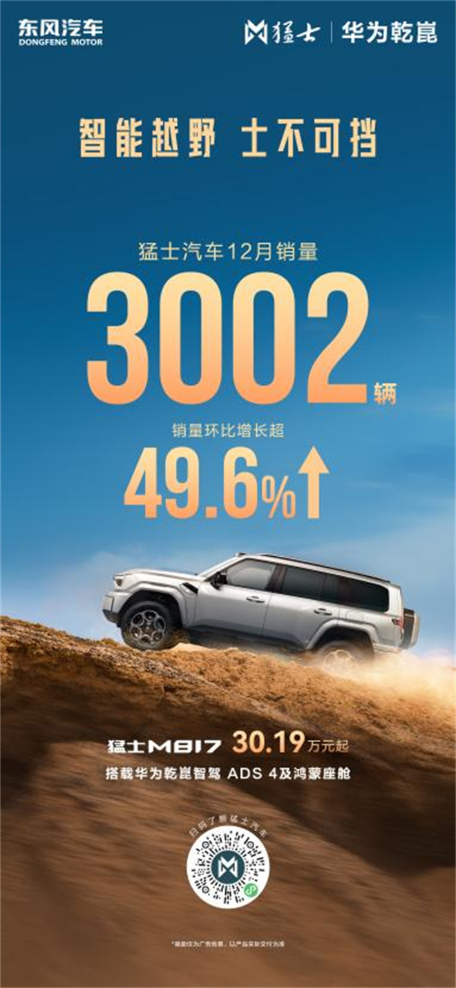 作為豪華智能越野賽道的標(biāo)桿之作,猛士M817自8月上市后,迅速躋身豪華新能源越野第一陣營,并且僅用4個(gè)月便達(dá)成萬臺(tái)下線,創(chuàng)下了高端新能源越野車型量產(chǎn)速度的新紀(jì)錄,同時(shí)在其帶動(dòng)下,猛士汽車自9月起銷量強(qiáng)勢(shì)實(shí)現(xiàn)“四連漲”。12月銷量更是達(dá)到3002臺(tái),銷量環(huán)比增長49.6%。