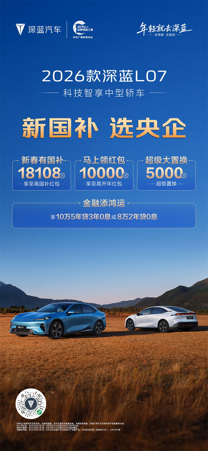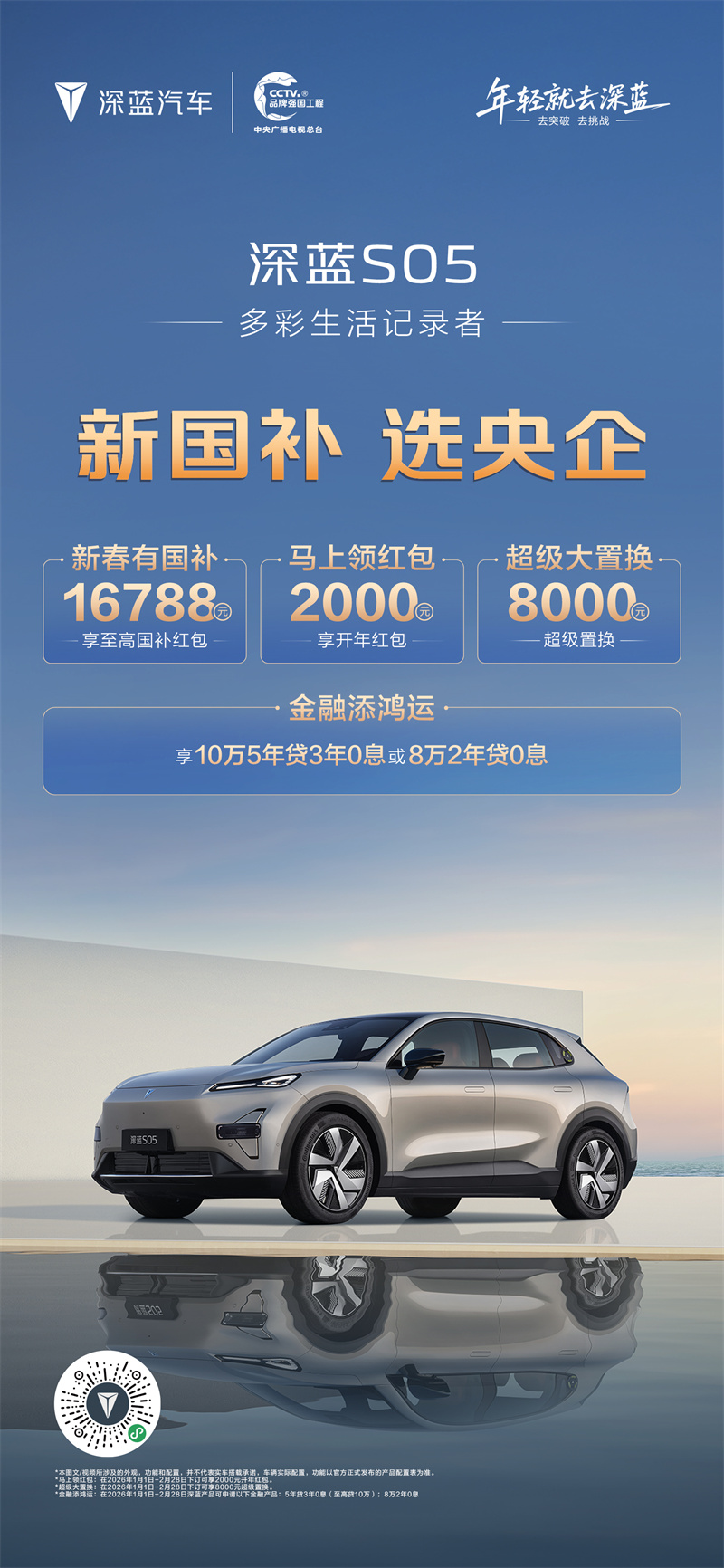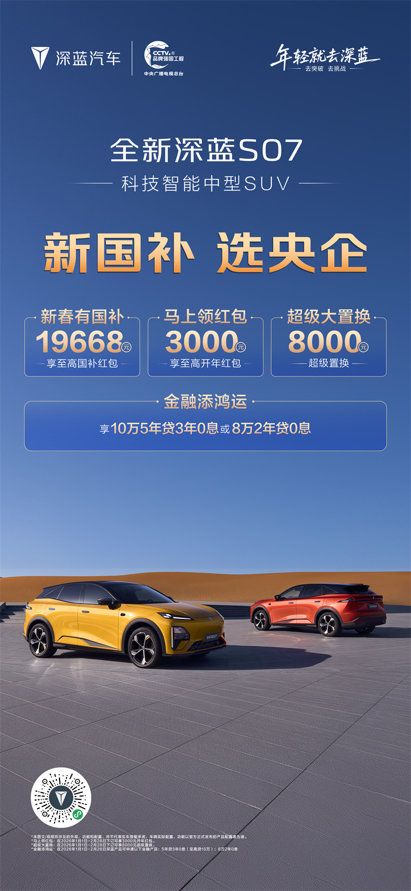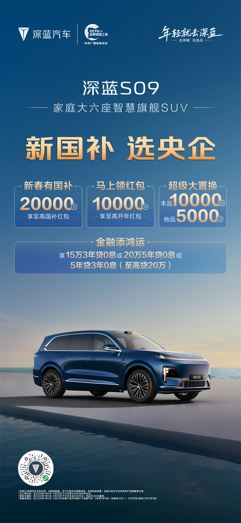 深藍汽車以"新國補 選央企"為主題,推出2026年首輪購車政策,涵蓋: