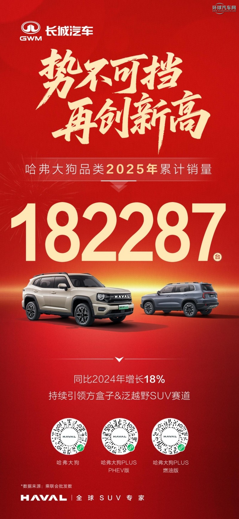 2025年完美收官之際,哈弗大狗再次以強勁的市場表現印證其不可撼動的泛越野領軍地位。最新數據顯示,哈弗大狗品類12月單月銷量達15,693輛,2025年全年累計銷售182,287輛,歷史累計銷量已達731,977輛。