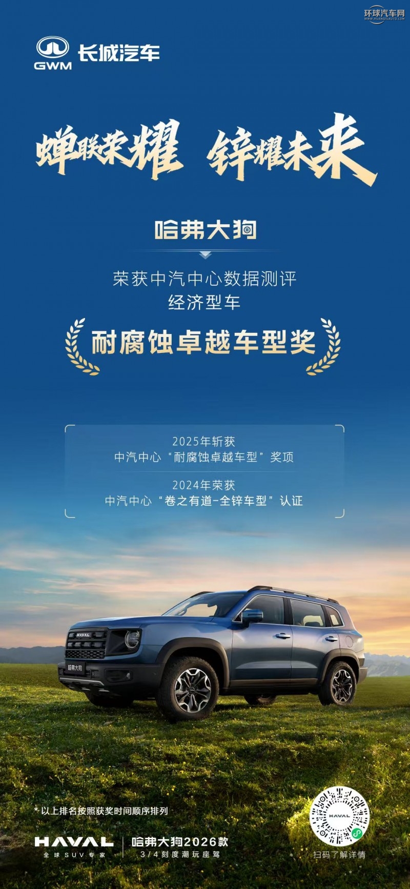 在銷量高歌猛進的同時,哈弗大狗品類也在權威評選中屢獲殊榮,贏得行業與用戶的雙重認可。哈弗大狗先后榮膺2025年中國燃油汽車用戶滿意度CACSI測評10-15萬緊湊型SUV第一名,以及中汽中心數據測評經濟車型“耐腐蝕卓越車型”獎項。