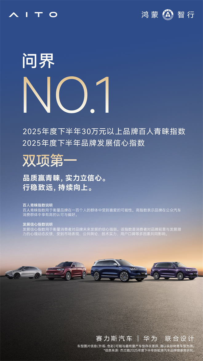 近日,杰蘭路咨詢發布《2025下半年新能源汽車品牌健康研究報告》。報告顯示,問界榮獲品牌NPS(凈推薦值)第一、品牌發展信心指數第一、30萬元以上品牌百人青睞指數第一;問界旗下“雙旗艦王牌”,再添口碑佳績:全景智慧旗艦SUV問界M9榮獲車型NPS (凈推薦值) 第一,家庭智慧旗艦SUV問界M8首次參評即榮獲NPS (凈推薦值) 第二。這一系列亮眼成績,無不彰顯問界在高端新能源賽道的引領地位。
