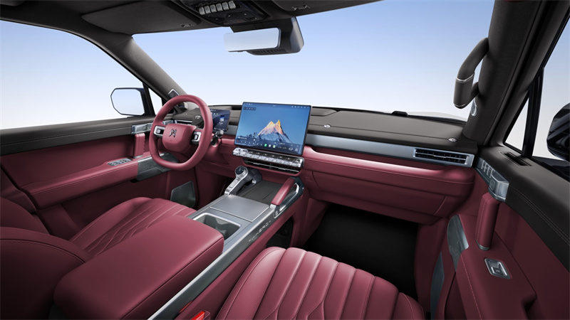 兼顧健康與豪華的同時,座艙內的硬核科技細節,更讓每一次操作都充滿儀式感與實用性。飛航旋鈕靈感源自戰斗機儀表盤,采用潛水腕表風格,金屬材質搭配金字塔紋理,精致又醒目;家族傳承式門把手如手槍握柄般握感堅實,關閉車門時的“上膛”音效,瞬間拉滿勇往直前的硬派氣場,喚醒內心深處的越野豪情。
