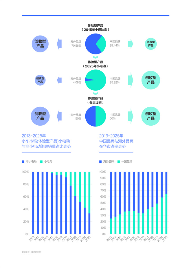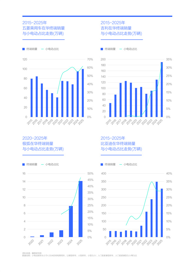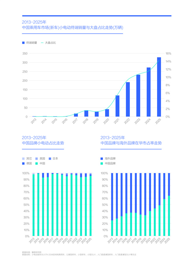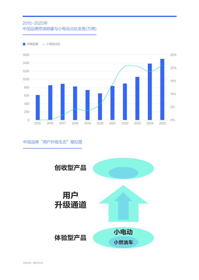 2025年,在體驗型產(chǎn)品為主的小車市場,中國品牌絕對主導的小電動的市占率逼近70%,為中國品牌重構“用戶升級生態(tài)”提供了肥沃土壤,也為中國品牌的高端化創(chuàng)造了絕佳機會;