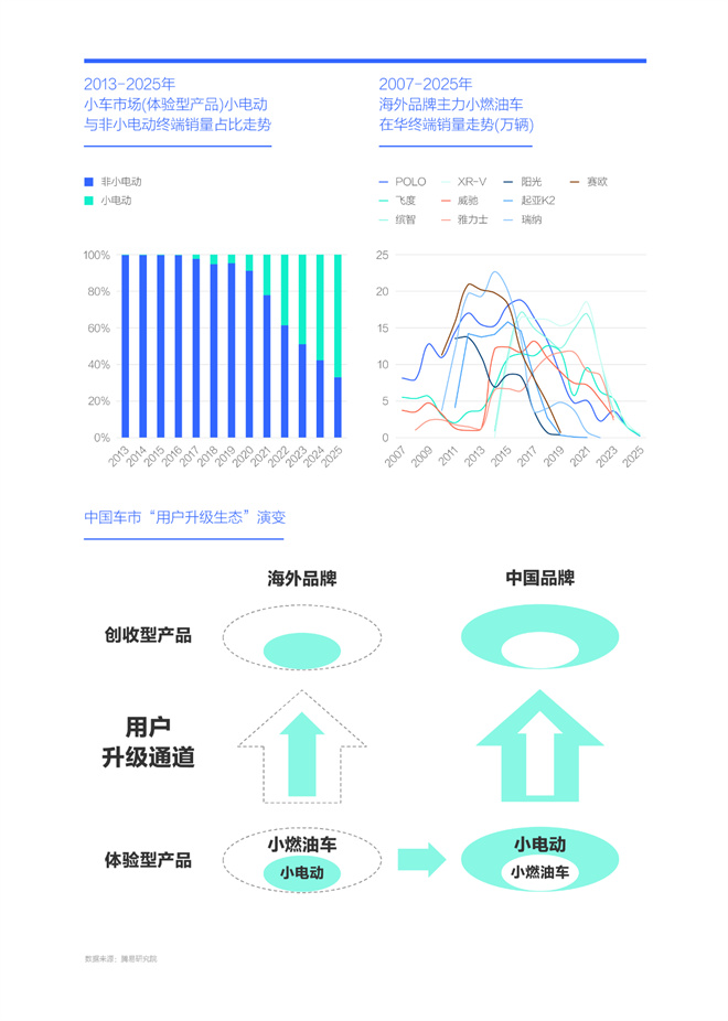 從拓展女性新賽道,到提升口碑,再到策反海外品牌的“他”,小電動除為中國品牌創(chuàng)造增量,還幫中國品牌重構了“用戶升級生態(tài)”,并順手瓦解了海外品牌基于小燃油車構建的“用戶升級生態(tài)”。2025年底,POLO、飛度等代表性小燃油車在華銷量微乎其微,接近停產(chǎn)狀態(tài),一個時代幾乎即將畫上句號;