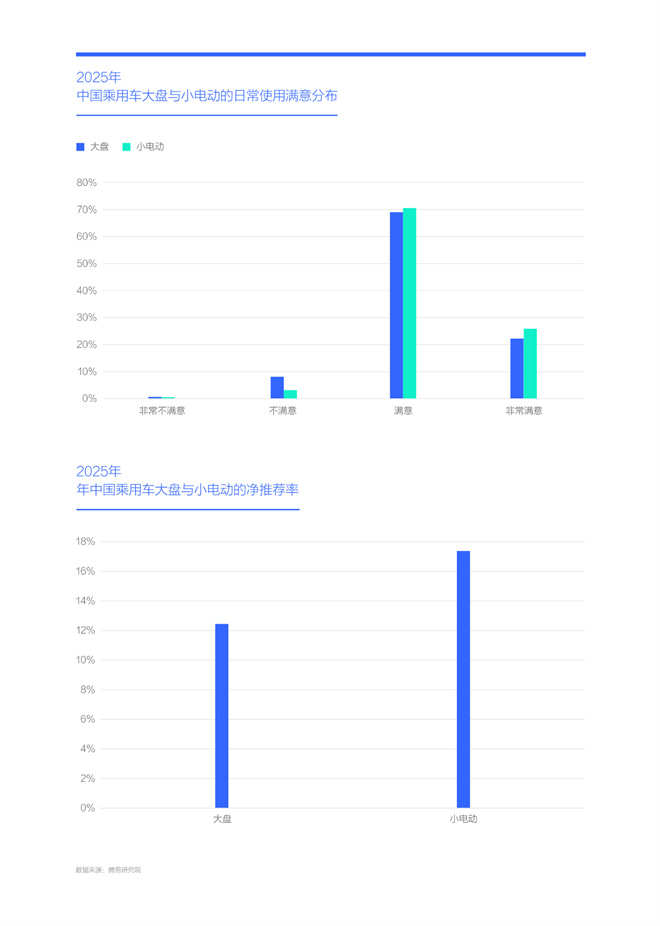 雖然中國品牌小電動仍保持著中國品牌的便宜傳統(tǒng),但在用料、設計、智能等方方面面,都有了大幅提升,甚至形成了優(yōu)勢,自然而然有利于提升用戶口碑與改善品牌形象。2025年中國乘用車市場的整體滿意度和非常滿意度分別接近70%和超22%,小電動則分別突破70%和接近26%,都高于大盤水平。2025年中國乘用車的整體凈推薦率僅12%多點,呈現(xiàn)下滑走勢,小電動突破17%,呈現(xiàn)提升走勢……